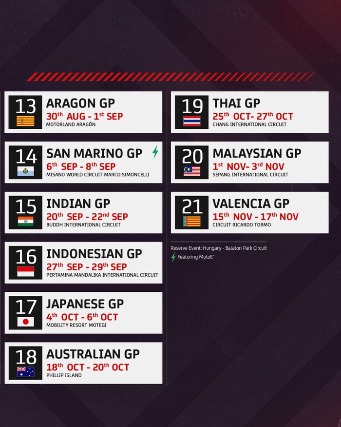 Selain itu ada balapan cadangan di Balaton Park Circuit Hongaria, yang siap berjaga-jaga jika ada balapan yang dibatalkan.