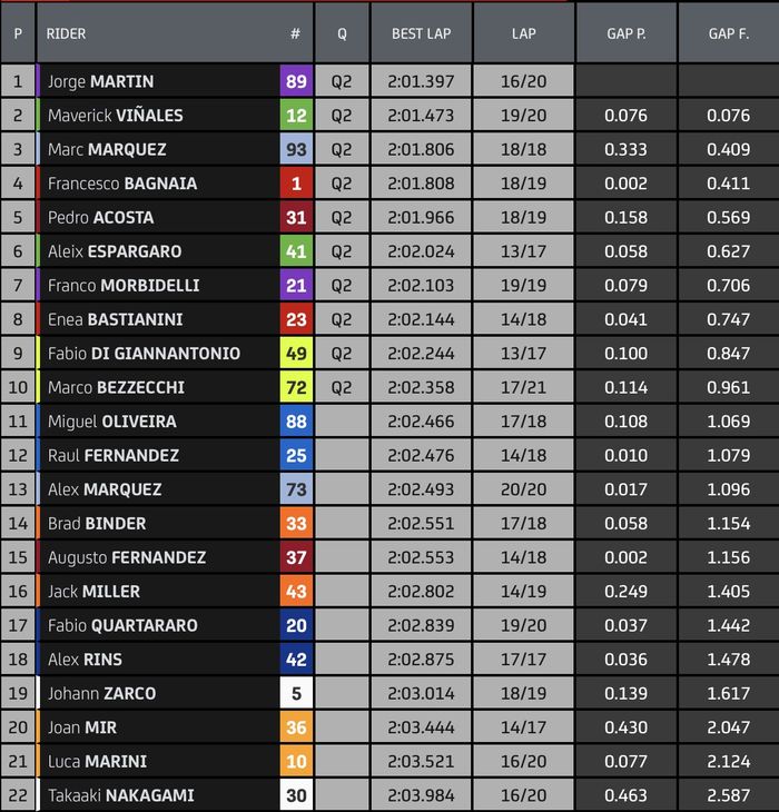 Lalu ada Enea Bastianini kemudian ada duo VR46 Racing Team, Fabio Di Giannantonio dan Marco Bezzecchi, yang menutup posisi 10 besar pembalap tercepat yang akan langsung lolos ke Q2.