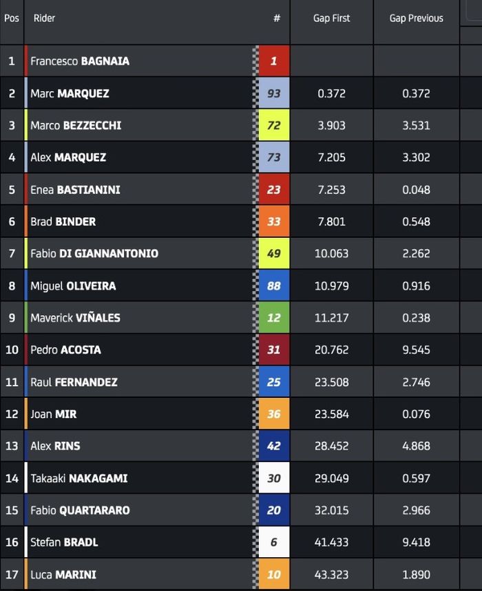 Sedangkan posisi keempat diamankan Alex Marquez, yang juga menunjukkan balapan konsisten meski kesulitan untuk mengejar rombongan terdepan.