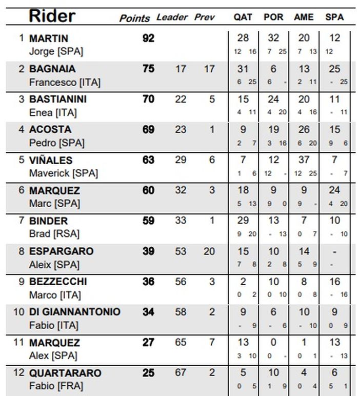Berikut tabel klasemen sementara MotoGP 2024:
