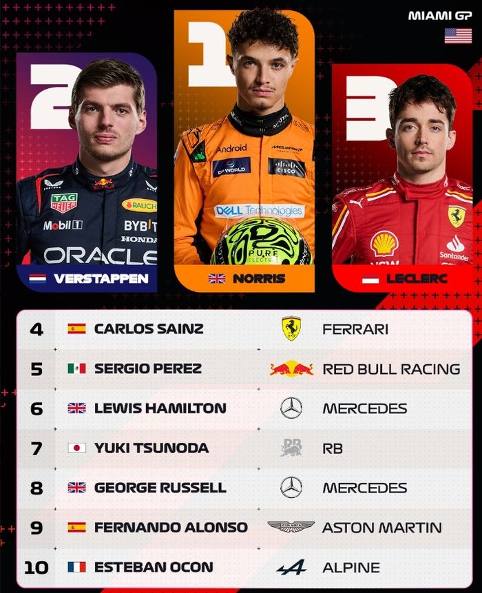 Verstappen yang menyerah untuk mengejar Norris, akhirnya memilih mengamankan podium dua di depan Charles Leclerc yang meraih podium tersisa.