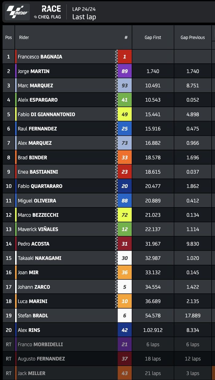 Fabio Di Giannantonio pun berhak atas posisi kelima, setelah melewati Raul Fernandez yang sebenarnya mengawali balapan dengan baik namun mulai kehabisan tenaga pada akhir balapan.