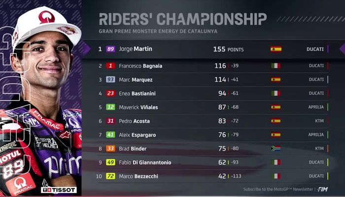 Jorge Martin masih kokoh memimpin kejuaraan dengan raihan 155 poin, sedangkan sang juara bertahan di peringkat dua dengan ketinggalan 39 poin.