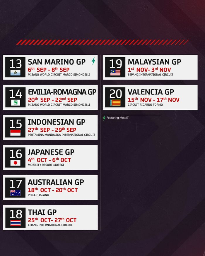 Kemudian ada MotoGP Malaysia 2024 pada awal November, ditutup dengan MotoGP Valencia 2024 pada pertengahan November.