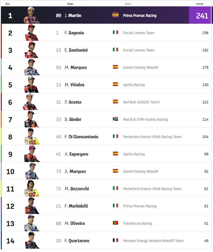 Tambahan 37 poin membuat Enea Bastianini kini mengoleksi 192 poin klasemen, dan duduk di peringkat tiga klasemen MotoGP 2024.