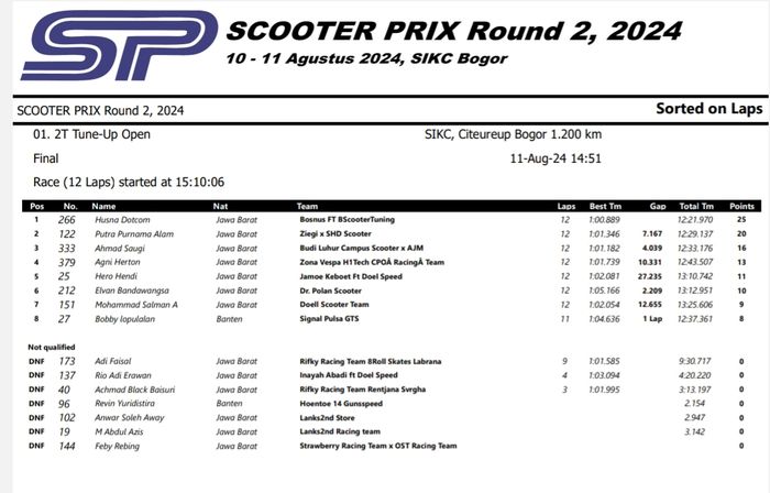 Lebih lanjut, untuk hasil balap di kelas utama kategori 2T Tune Up Open, Husna Dotcom dari tim Bosnus FT BScooter Tunning masih menjadi yang tercepat.