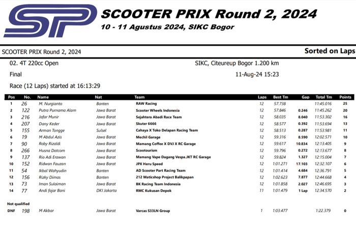 Berikut hasil Scooter Prix 2024 Round 2 untuk Kelas Utama yang berarti nomer 1 jadi Vespa paling kebut di balapan ini :