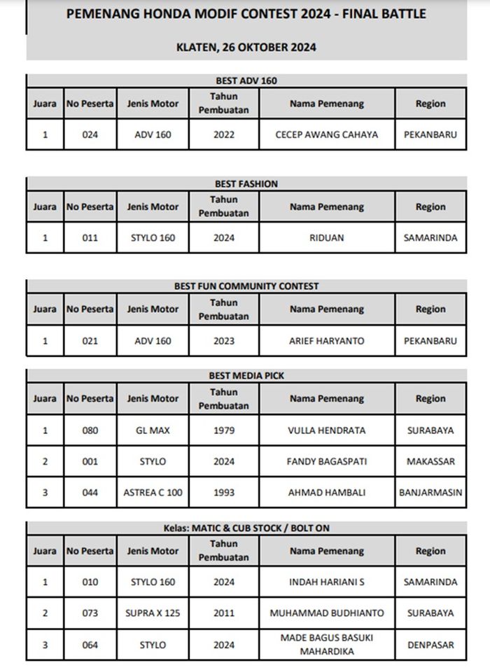 Para juara nasional Honda Modif Contest 2024 ini mendapatkan hadiah berupa uang pembinaan dan memiliki kesempatan menjadi modifikator Honda Dream Ride Project yang didampingi langsung oleh mentor modifikator handal Indonesia.