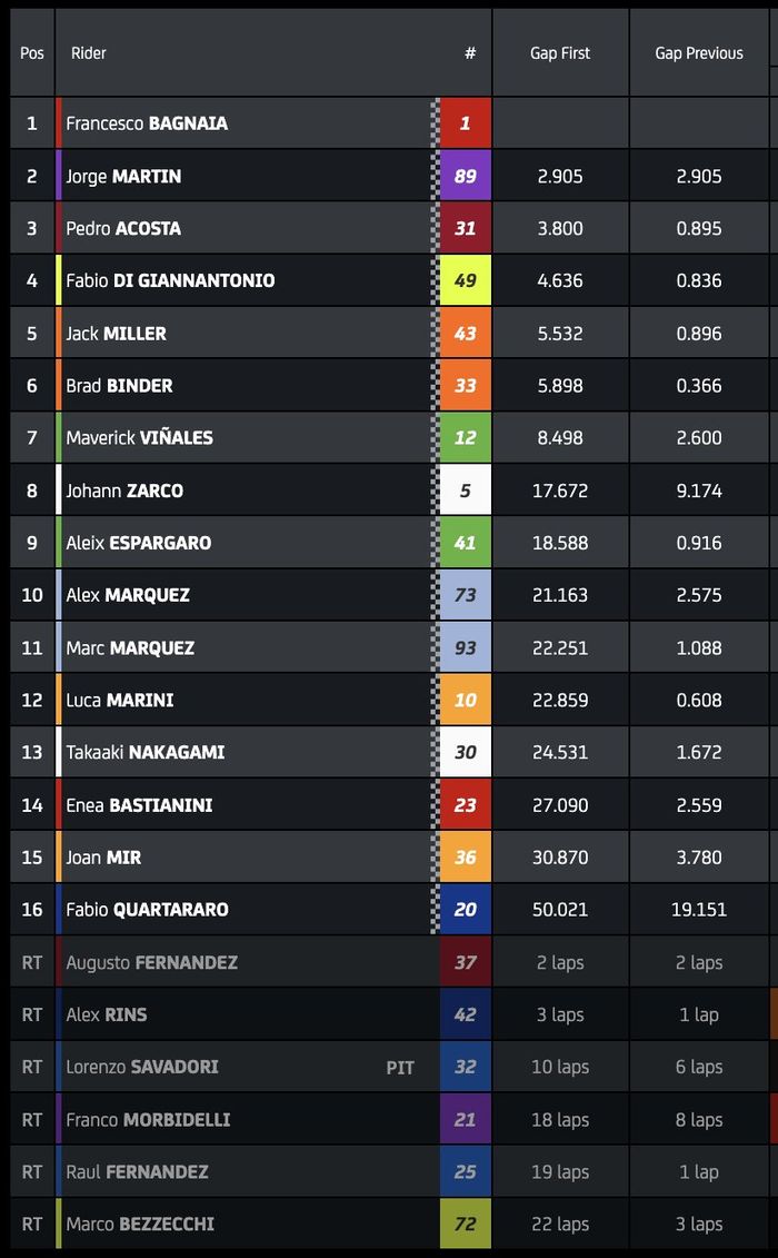 El Diablo harus terjatuh dan gagal finis, Morbidelli langsung mendapat long lap penalty namun malah nyusul crash juga beberapa lap setelahnya.