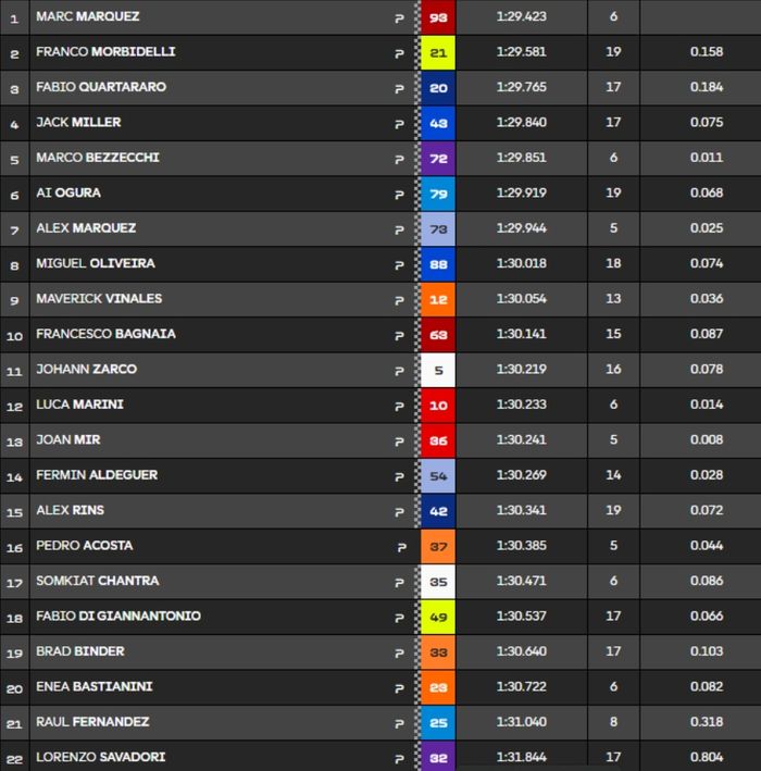 Marc Marquez mencatatkan waktu lap terbaik dengan 1 menit 29,423 detik, mengalahkan Franco Morbidelli di posisi kedua dengan selisih 0,158 detik.