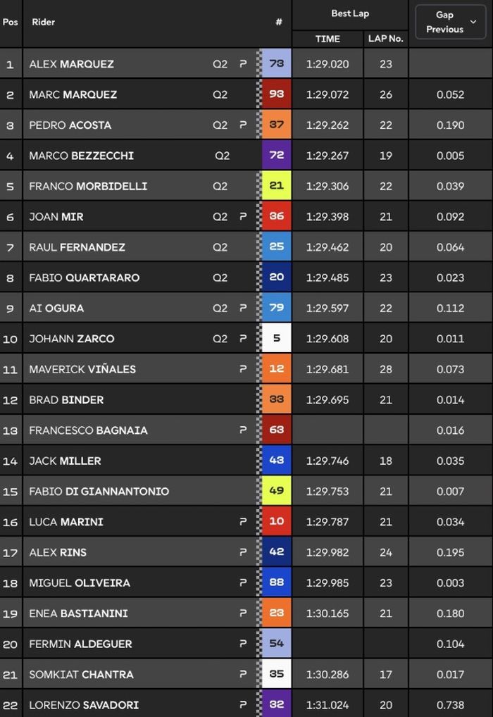 Posisi ketiga diamankan Pedro Acosta, disusul oleh Marco Bezzecchi dan Franco Morbidelli yang melengkapi lima besar.