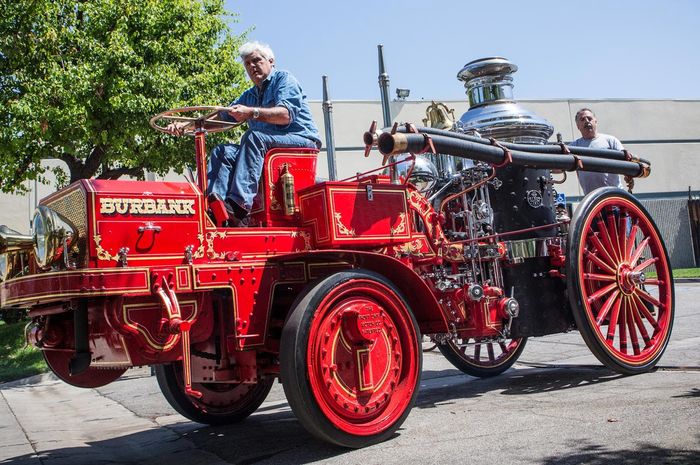 Jay Leno, aktor, komedian dan pembawa acara tevlevisi kondang di Amerika, mengendarai truk yang dibuat sekitar tahun 1911 silam ini.